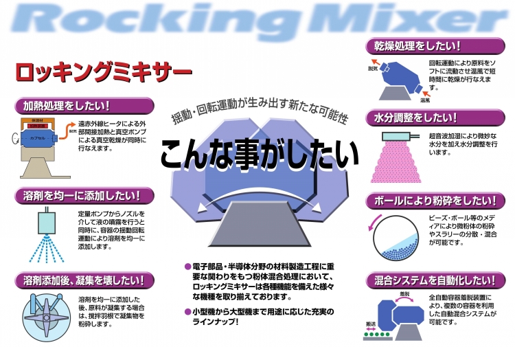 ロッキングドライヤ、ロッキングフロードライヤ、ロッキングボールミル、エアフローダなど、