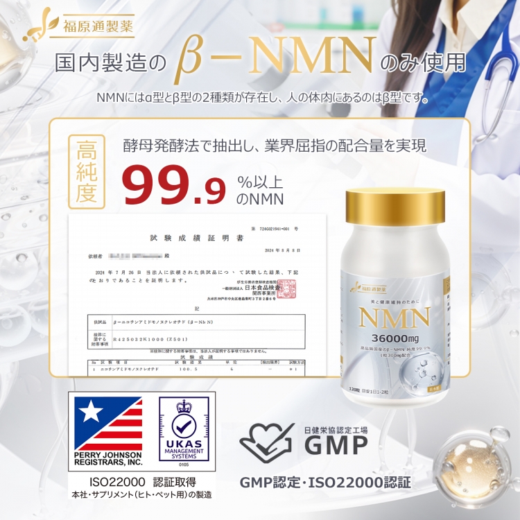 高純度(99.9%以上)の国内製造原料を使用し、GMP・ISO22000認証工場で生産された高品質な健康食品です。