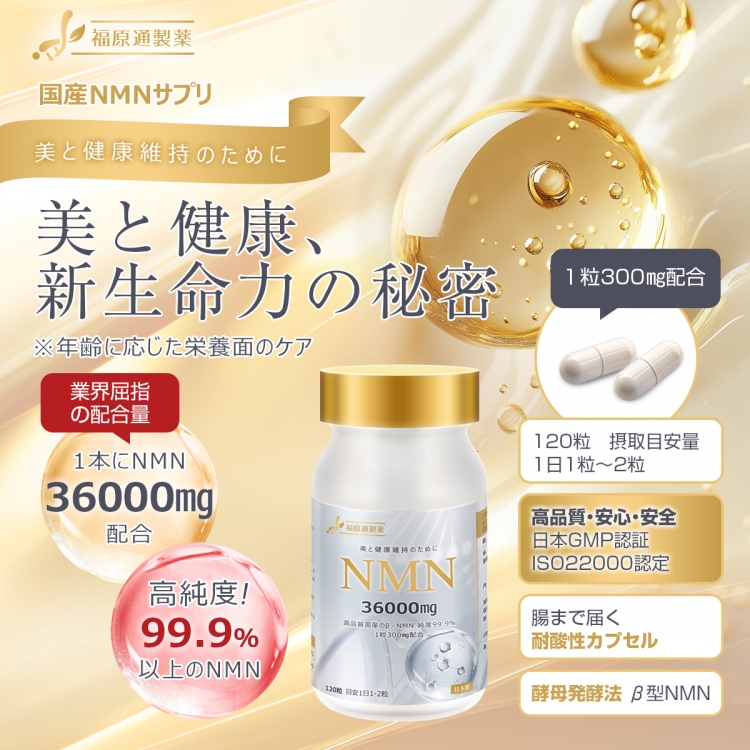 1ボトルにNMN36000mgを配合し、エイジングケアや健康維持をサポート。NMNはNAD+(補酵素)の前駆体として体内で変換され、サーチュイン遺伝子(若返り遺伝子)を活性化し、老化抑制や健康寿命の延伸が期待されています。