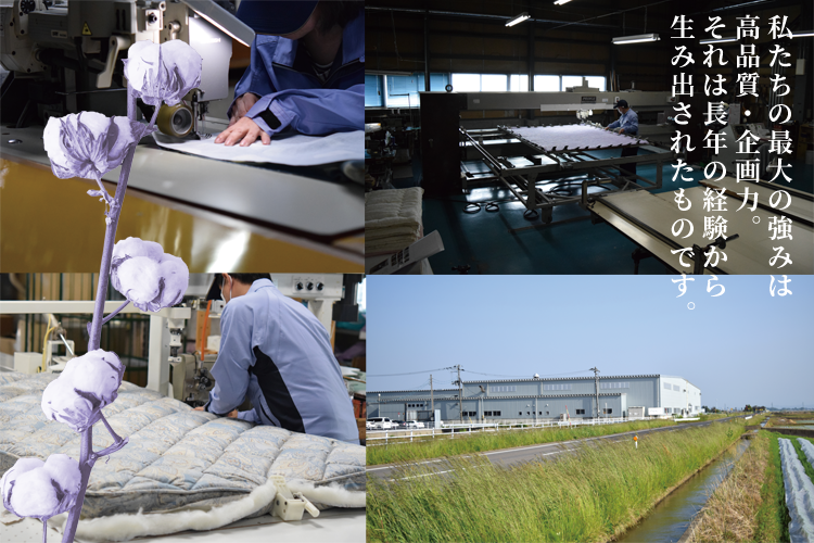 創業明治44年。ベテラン職人と 国内屈指の自社縫製工場を有する、新潟の寝具・寝装品の総合製販企業。